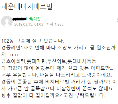 이미 저 건물이 터가 닦인 상태에서 시공사가 부도가 났나 그래서 빈터로 남아있었을 뿐 저 곳에 건물이 올라간다는 건 다 알고 있었어요. 생각보다 공터로 남아있던 기간이 길어졌는데 그 사이에 비치베르빌이 들어선 거예요. 그리고 저기가 고가도로가 있다가 철거된지 얼마 안되서 우중충했던 동네가 살아나기도 했고 말많고 탈많은 엘시티 근처라 반사이익 얻으려고 기대 잔뜩하다가 저거 들어서면서 그 기대가 바사삭 무너지니까 더 난리치는거죠. 저기 지나갈 때마다 참 답없다싶지만 비치베르빌에서 몰랐다도 말 안되는거고 이미 허가가 먼저 난 곳은 공사 중인 저곳이었어요;;