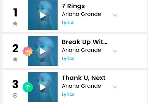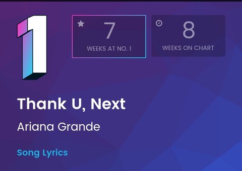 Thank u, next(2018년 1위 6번 2019년 1위 1번),7 rings(2019번 1위 8번) 두 곡으로 아리아나 그란데는 빌보드 올해 1위 9번했는데 테일러 스위프트 신곡 ME 100위 진입해서 1위도 못함 완전 퇴물됐음ㅋㅋㅋ그리고 아리아나 그란데 비틀즈 이후로 55년만에 1~3위 차트 진입한 가수됐음 테일러 스위프트도 못한 기록인데ㅋㅋㅋㅋ