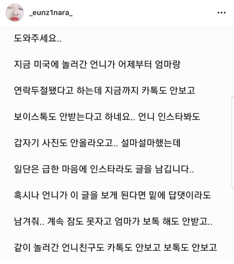 사람들 왤케 꼬였냐.. 당연히 해외가서 자식,언니가 연락 안되면 진짜 걱정되는게 당연한거 아니냐.. 하루도 아니고 이틀이고 같이 간 친구도 연락이 안된다는데..?
