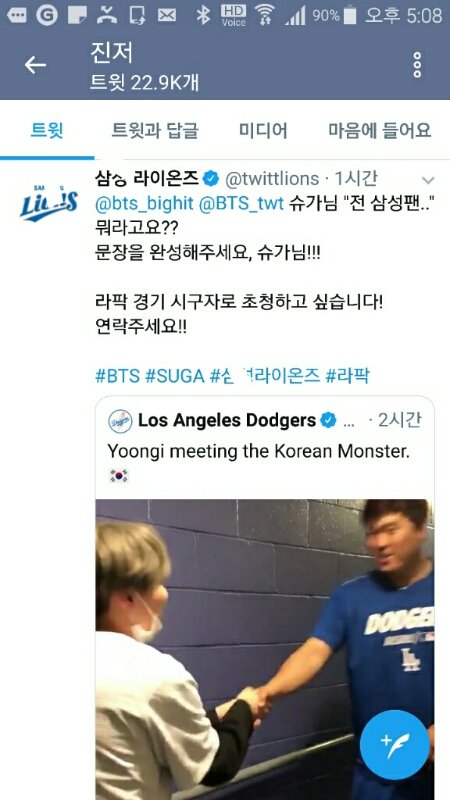 영상보면 야구장에있던 사람들이 슈가 알아보고 하이파이브함ㅋㅋ 글고 경기장에 방탄 아이돌노래 울려퍼지고있고 다져스 공계에도 방탄왔다고 올리고 그걸본 삼성공계가 우리한테도 와달라면서 트윗올리고 있다ㅎ
