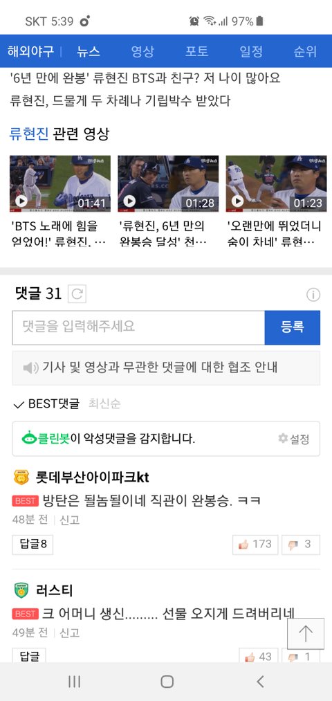 류선수 스포츠뉴스 댓글바 ㅋㅋ