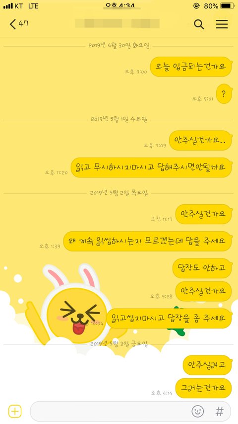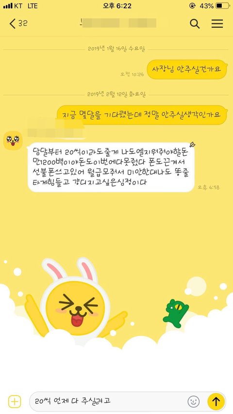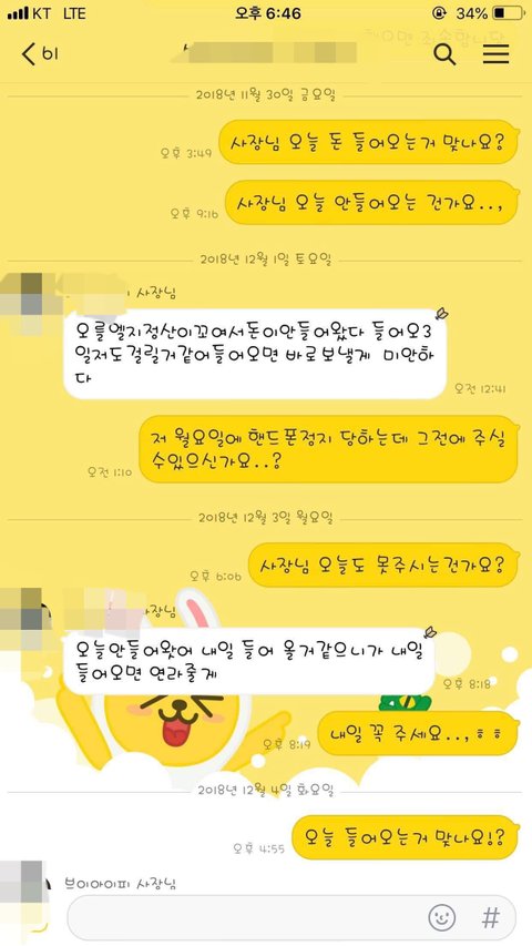 안산에 거주하고 계신 30대 초반 윤x진 아시는분 있으실까요?ㅠ 그리고 술먹고 담배두갑씩 들고다니며 놀러가실 돈이 있으시면 밀린 제 월급이나 주었음좋겠습니다 윤x진 사장님. 좋은 아빠 되셔야죠 ㅎㅎ 저도 여기올리는거 자체가 쪽팔리지만 받을건 받아야겠습니다