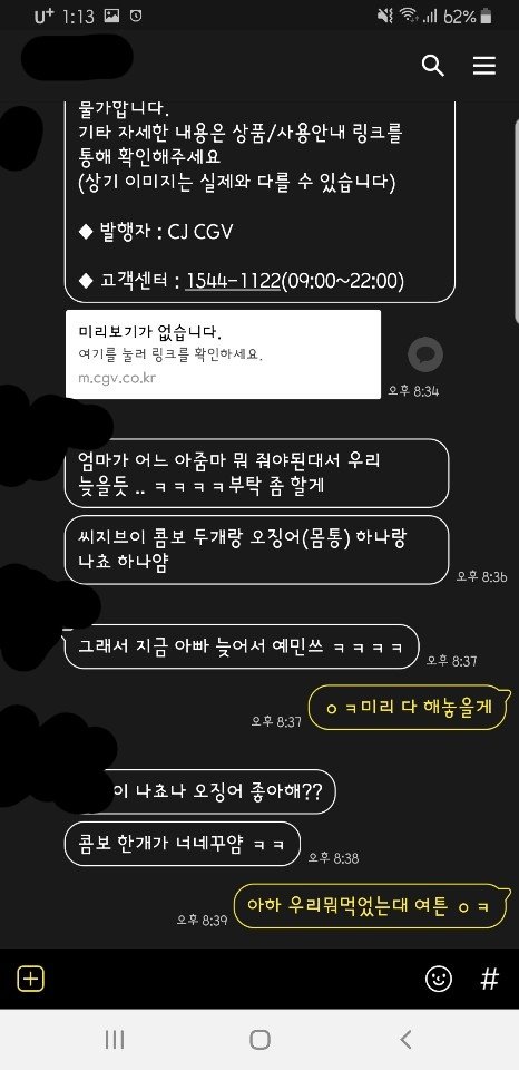 영화관 앞에서 인사 잠깐하고 영화보러 들어감. C네 커플은 가림막있는 커플석랑 콤보 주고(나중에 돈 줬음) 나머지 우리 가족들은 넷이서 앉아서 봄. (미리 예매할때 불편하지 최대한 말라고 따로 떨어지게 분리해서 예매해놓음)