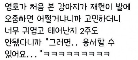 (애기 강아지가 재현 허벅지에 쉬야함)
