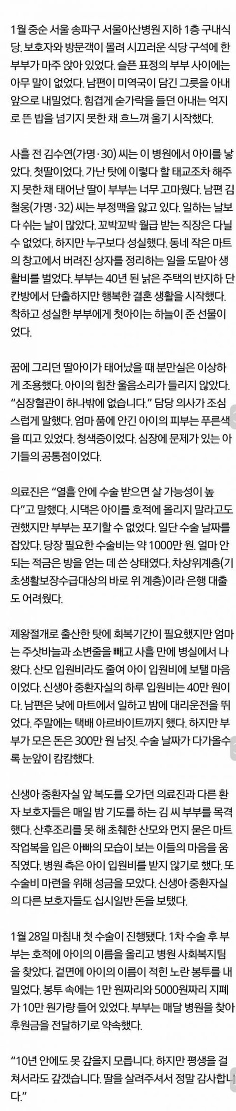 태어나준것만도 고마운 딸, 어떻게든 딸을 살리려는 부부, 좋은 마음으로 수술해준 병원, 같이 보태준 사람들, 은혜를 갚으려는 부부 어느 누구 하나 나쁜 사람도 없고 착한 사람들 뿐인데 댓글들 참.... 제발 애낳지 마세요들. 당신같은 사람들을 받아드려야 하는 세상이 너무 불쌍해지니까