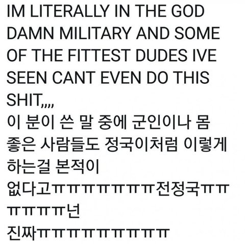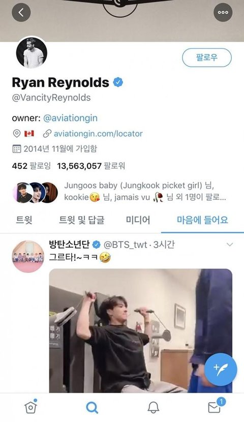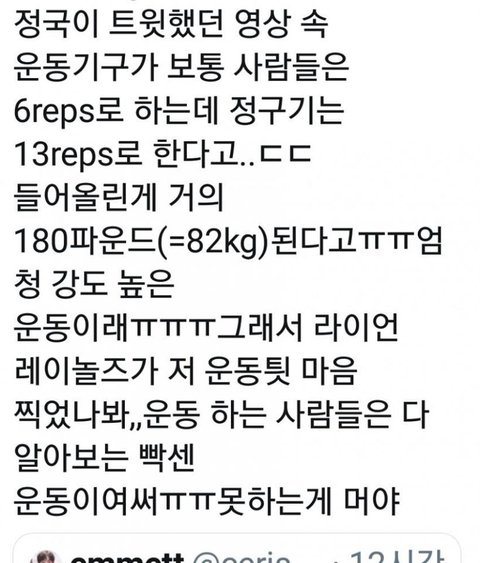 보통 성인 남성들이 6reps 정도 하는데 정국이는 13reps한 쪽 무게만 무려 40kg가 넘는다고...ㄷㄷ라이언 레이놀즈가 정국이 운동 트윗에 좋아요 누르고 방탄 팔로우함 ㅋㅋㅋㅋㅋㅋㅋㅋ