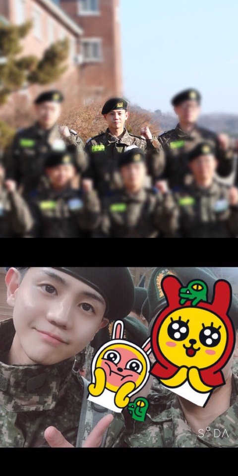 원본 사진은 못찾았으나 훈련소 썰 중에 가장 기억에 남는건 편지가 어느날은 거의 900통이 왔는데도 그걸 하나하나 다 읽었다는 이야기.. 훈련소 내에 라디오 비슷한 프로그램 하는데 일일 DJ 했다는 이야기.. 팬들이 초코파이 박스채로 보내서 엄청난 환호성을 샀다는 얘기..당신 그냥 넘 귀여워,,