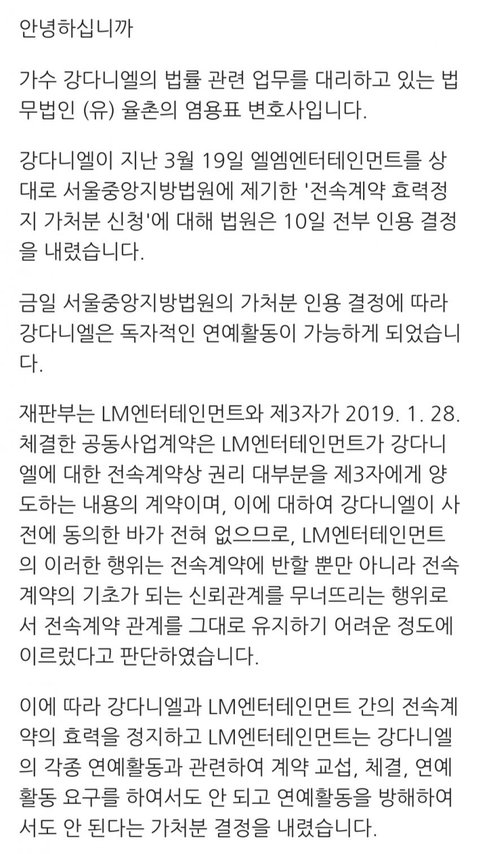 따라서 이전소속사계약은 효력정지되고 앞으로 전소속사가 강다니엘 연예활동에 간섭하거나 방해할 수 없다는 판결이 나옴