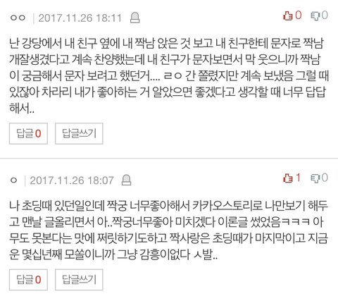 +) 판녀들아 ㅠㅠㅠㅠㅠㅠㅠㅠ 너네가 써준 댓글 하나하나 다 읽고 다 답글 남겼었는데 어떻게 하다보니 다 삭제됬다....ㅋㅋㅋㅋㅋㅋ 하 허탈해... 고맙다는 말 다 전해주고 싶었는데 내맘 알지 판녀들 ㅠㅠ?? 조만간 전남친 썰 모음 올릴테니깐 많이 봐죵 ❤️❤️❤️