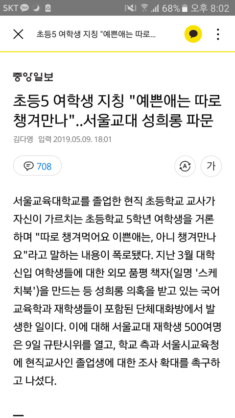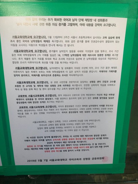 여학생 지칭 "예쁜애는 따로 챙겨만나"..서울교대 국어과 성희롱 또뜸