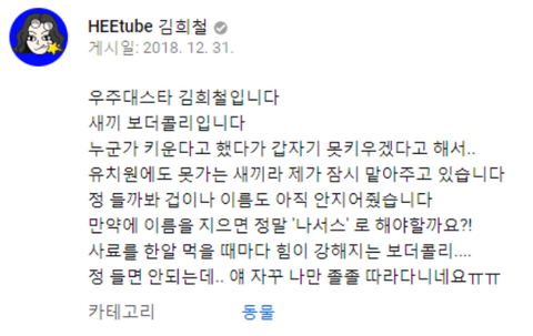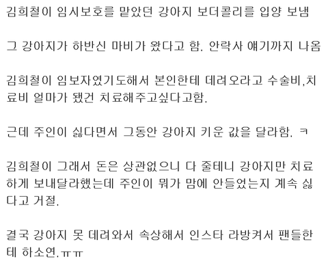 돈요구한 사람이 김희철한테 분양받고, 다른 삼자한테 혈통좋은 개라고해서 200만원에 분양함. 알고보니, 혈통서는 가짜 근친교배로 인한 선척성 기형 현견주가 동배도 그런거 아니냐 모견을 데려오면 검사해보겠다 라며 적극적으로 수소문끝에 근친임을 알아냄, 돈요구한사람이 병원비를 보태겠다하고, 알고보니 김희철에게 병원비 요구.. 자기가 키우지않으니 강아지를 김희철에게 줄수없음... 이런저런 오해가 쌓ㅇㅕ서 현견주가 욕먹는중.. 김희철이랑 연락해서 오해는 풀었다고함.... 같은 보더콜리 키우는 사람으로.. 안타까움ㅜㅜ 인간에 욕심으로 태어난 생명은 무슨 죄 인가싶음ㅜㅠ
