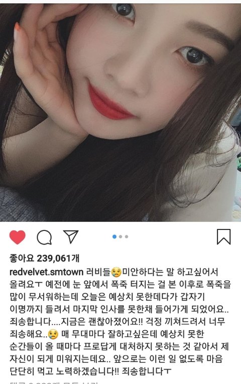 오늘 이슬 라이브라는 행사를 하는데 마지막 엔딩 포즈때 폭죽이 엄청 크게 터졌는데 조이가 너무 깜짝 놀라서 귀막고 주저앉다가 책상 아래로 달려가길래 어 뭐지 갑자기 왜 그러지 무슨 문제지라고 생각했는데