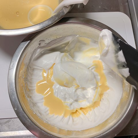 딱딱하게 흰자 머랭이 만들어 지면 미리 섞어 놓은 팬케익 믹스를