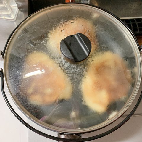 팬케익의 겉이 익으면 뚜껑을 닫아 속까지 익혀 준다.