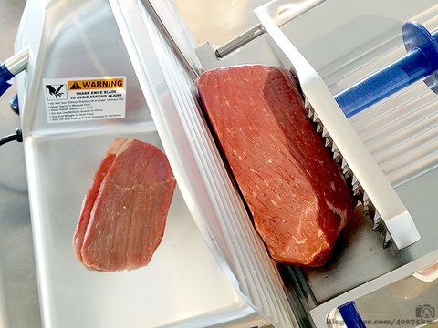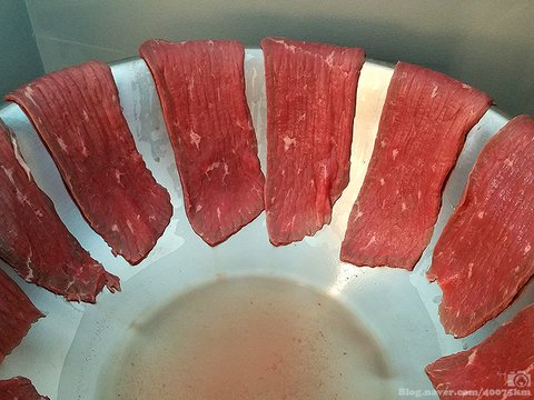 주변에 고기 잘라주는 정육점도 없고 고기 슬라이서도 없으면 고기를 살짝 얼린 다음 칼로 썰어내는 방법도 있습니다.