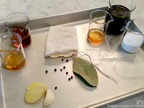 삼투압 현상을 이용해 고기의 수분을 쫙 빼낼 수 있도록 염분과 당분이 기본적으로 들어가고, 여기에 맛을 더하는 부재료가 첨가됩니다.