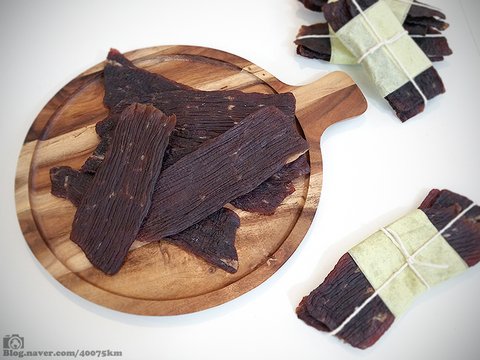 미국에서 육포를 먹는다고 하면 왠지 록키산맥 벌목꾼이 도끼 옆에 꽂아놓고 위스키 한 모금 마신 다음 육포를 질겅거리는 이미지를 떠올리기가 쉬운 반면, 한국에서 육포는 나름 고급스러운 간식에 속합니다.