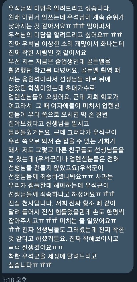 김우석이 너무 심하게 사실 관계없이 몇개의 짤로 이상한 사람으로 몰아가며 마녀사냥 되는것 같아서 올려 ㅠㅠ