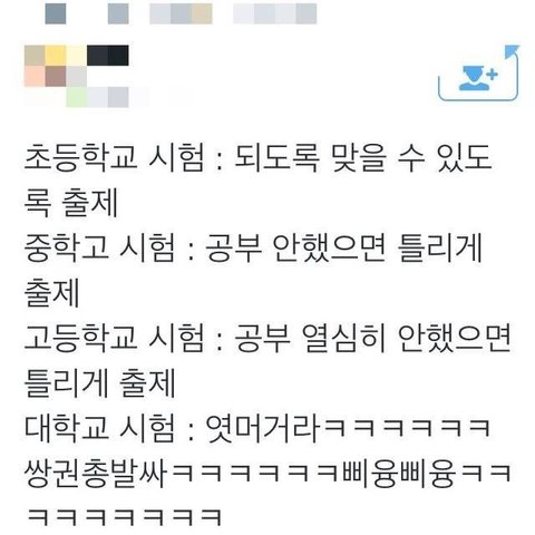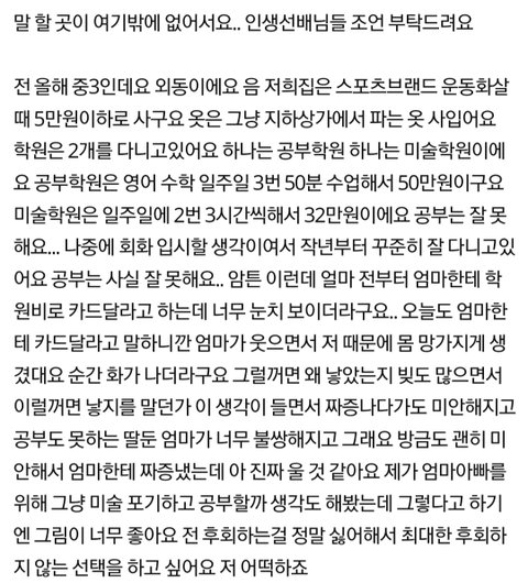 울아들이랑 동갑이네. 학생아 착각하지 마라. 공부 못하는거 안고 안하는거다. 그나마 울 아들은 돈 들인 수학, 영어는 잘 하던데.. 나머지가 폭망이라 글치 ㅎㅎ 암튼, 너한테 쓰는 돈이 아까운게 아냐. 니가 너무 열심히 학원 전기세, 수도세 내고 있는게 아까운거지. 너, 너무 가성비 떨어지는 학생이다. 정신차려라. 예체능도 빡대가리들은 어렵드라. 이도저도 아니면 기술이라도 배워라.