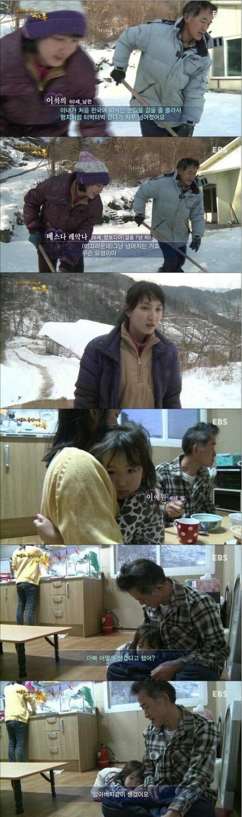 결혼 7년차 남편 60세 아내 26세 딸 6세..... 으 7년전이면 53세에 19살 짜리 데려와서 바로 임신 시킨거 아녀... 영감탱이 돌았나.... 지원금 몇백씩 주고 매매혼은 왜 시키는 거야