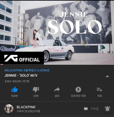 제니 한국 여솔로 최초 SOLO M/V 조회수 3억 달성