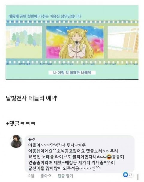 우리학교도 이대보고 에타에 이용신 성우불러달라는 글 올라옴 솔직히 힙찔이들 공연보다 백만배 신나고 좋아