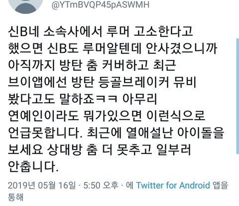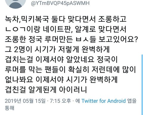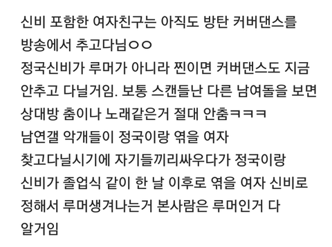 결국 몇년동안 정국으로 연애루머 만들고 까고 글 올린 애들은 정신병자고 거기에 넘어간 애들도 이글을 보고 루머를 더이상 사실처럼 얘기안했으면 좋겠다