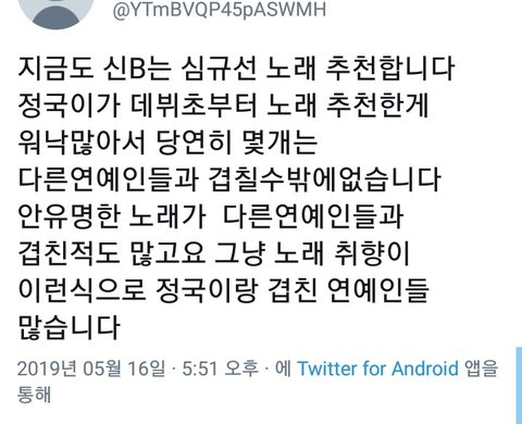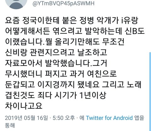 요즘은 국내활동이 줄어들어서 엮을만한 여자연예인이 안보이니 정국이가 최근 커버곡까지 녹음해서 올리고 채팅에서 언급까지한 말도안되는 아이유로 정해놓고 루머퍼뜨리기 하고있음 ㄴ.ㅇ.ㄱ 갤에서ㅇㅇ