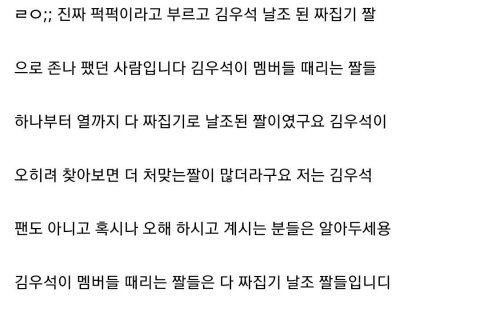 김우석 까려고 악의적인 짜집기 날조짤들 만들어서 퍼트렸다고 양심선언함.