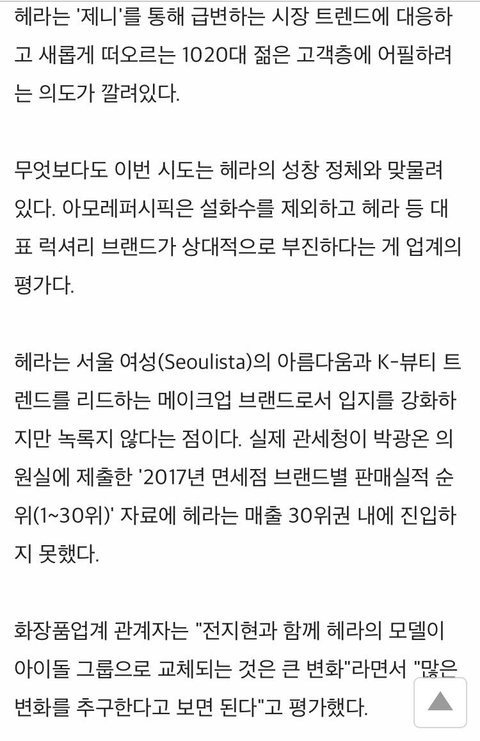 내가 뷰티업계에 관심이 많아서 (로레알에서 일하는게 꿈임) 헤라 모델 제니라고 처음에 들었을땐 원래 모델이 전지현이였으니까 좀 당황스럽긴했는데 (알고보니까 전지현에서 제니로 교체된게 아니고 둘다 모델임) 아모레퍼시픽이 아무생각없는 회사도 아니고 아시아 화장품 1위 대기업인데 아무생각없이 모델정한게 절대 아님;;; 요즘 제니가 10 20대 뷰티트렌드로 자리잡은거 맞고 헤라가 원래 좀 연령층 많은 여성고객 타깃으로하다가 이제 10~20대 젊은층도 노리자고 생각한거지 ㅇㅇ 광고주가 모델 잘고른 케이스 맞음