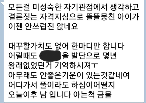 (이름) 불특정 다수들을 보고도 욕을 하고, 타인의 고통을 자신의 쾌락을 위한 도구로 생각하며, 남에게 피해를 주는 오래된 이 상황을 어른뿐만 아니라 아이들이 모두 알고 있으면서도 가정에서 아무런 조치없이 유지되는 지금 더 이상 참기 어렵습니다. 정작 피해자인 제가 있음에도 불구하고 제대로 된 '사과' 한 마디 없이 제가 모든 걸 다 이해해주길 바라는 것 같은데, 전 그리 좋은 사람이 되지 못합니다.