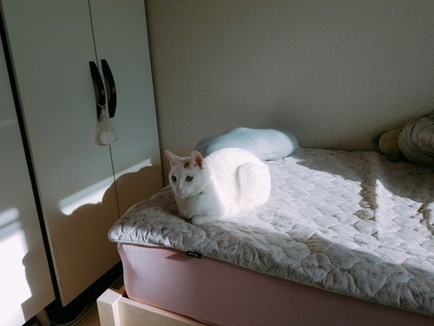 고양이가 내 침대에서 자는건지 내가 고양이 침대에서 자는건지 모르겠어. 쟤가 더 자리 많이차지해..