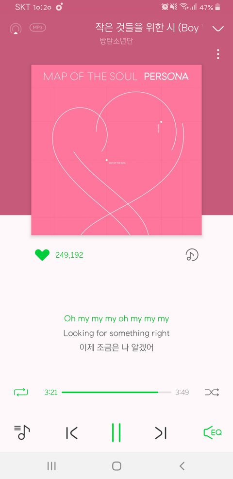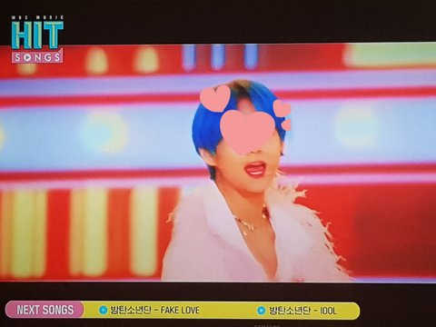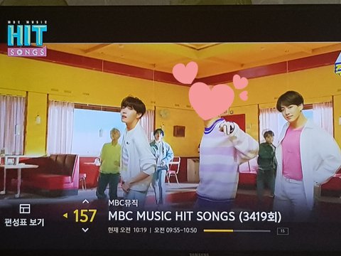 지나가다볼거없어서 틀고 잇엇는데 히트송인데 방탄이들노래만나오네요~~방탄특집도 아닌데 ㅎㅎ너무좋아서 걍 찍엇더니 사진이 흔들려서 방탄이들 얼굴이 ㅜㅜ 이뿌게안나오고 이중으로 흔들려나와서 급수정ㅜㅜ