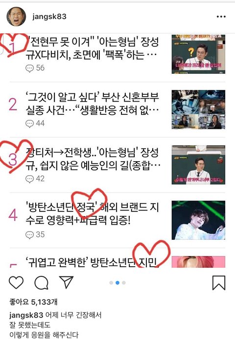 본인 기사에 댓글 정독하는거 좋아하시는 장티쳐님이ㅋㅋㅋㅋㅋ 애들 기사에 하트그려놓으셨길래 보고 빵터짐ㅋㅋㅋㅋㅋㅋㅋ아는행님때 인연땜인가ㅋㅋㅋㅋㅋ장티쳐님 귀여움ㅋㅋㅋㅋ