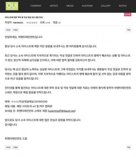 위 엔터테이먼트에서 김요한에 관련한 각종 루머들은 전부 법적조취를 취한다고함.