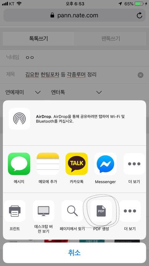 옆으로 쭉 넘기면 맨 마지막에 pdf 생성이라는게 나옴. 이걸 클릭
