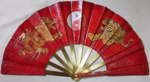 가죽에 용과 호랑이를 카빙하고 천연염색과 동판으로 만든 부채살을 사용하여 럭셔리하게 제작한 무예(무술),인테리어용 가죽