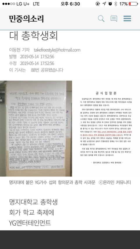 우리학교에서 이번 축제때 YG가수 불러서 대자보도 붙었는데 결국 취소 안하고 공연 하더라고..