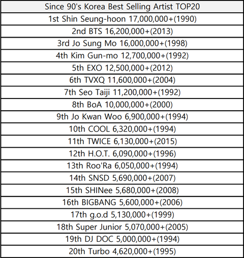 90년대이후 아티스트 앨범판매량 TOP20