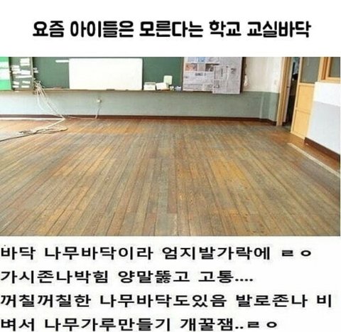 난 01년생인데 초딩때 이 바닥이였음 그래서 가시 찔리기 싫어서 맨날 뒷꿈치 세워서 조심조심 걸어다니고 주기적으로 왁스칠?인가 해줘야되고 ㅋㅋㅋㅋㅋㅋㅋ 추억
