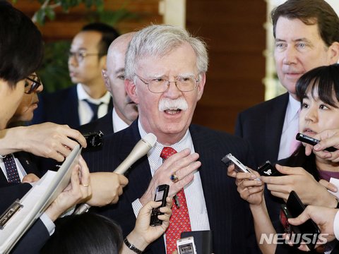 (사진 설명) 【도쿄=AP/뉴시스】존 볼턴 미 백악관 국가안보보좌관이 25일 일본 도쿄에서 기자들과 만나 얘기하고 있다. 2019.05.25