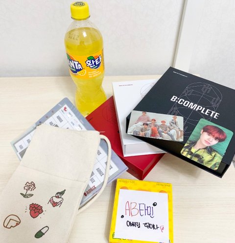 Ab6ix 멤버들의 손그림이 인쇄된 미니백 스타벅스만원권 비타민등 알찬 역조공 세트 너무 부럽더라