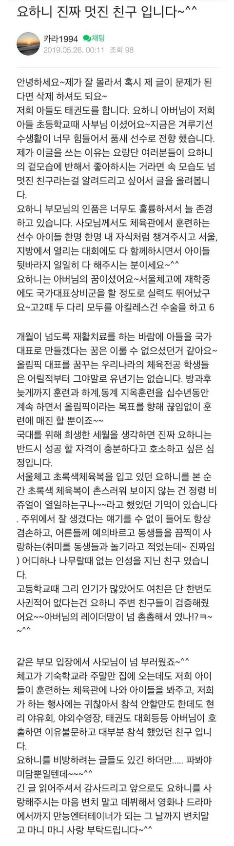 어릴때부터 태권도 국대를 하기위해서 자기 학창시절을 태권도에 다 바친것같은데..