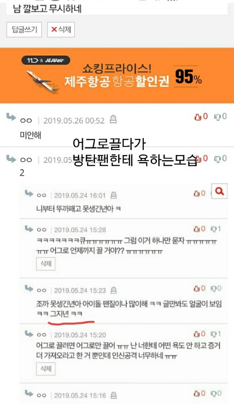 또 방탄소년단 누구누구..ㅋㅋ!! 하면서 정신병자같은 글쓰는애도 얘임