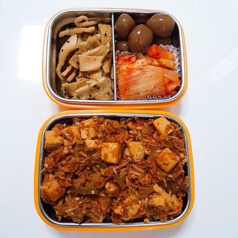 마파두부팽이덮밥, 어묵볶음, 메추리알장조림, 맛김치