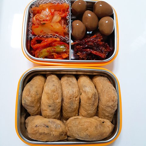 유부초밥, 맛김치, 무말랭이, 메추리알장조림, 오징어채볶음
