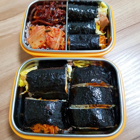 김밥도 반휴이던 날 만들고 다음날 도시락으로 챙겨갔어요. 스트레스를 요리로 풀곤 했는데(아무생각도 하지 않고 반복적인 칼질만 하며 스트레스 푸시는 분들 또 안계시나요?;-;), 그래서 이것저것 손이 꽤 가는 요리들을 하는 걸 좋아해요. 혼자 사는데도 손이 커서 예전에는 작은 밥솥에 밥을 두세번 해서 10-15줄 정도를 만들었는데, 이젠 밥은 딱 한 번만 해요! 그래서 이번에는 여섯줄정도 나왔어요:)