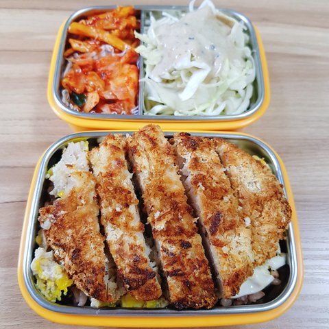 아침에 아침 공부, 독서실 갈 준비할 동안 에어프라이어에 돈까스를 돌려놓고 간장에 이런저런 양념넣고 달걀 풀어 끓이다가 돈까스랑 합쳐준 후 밥 위에 올려주었어요. 간장이 많이 들어갔는지 좀 짰지만 고기는 그래도 맛있으니까요. 그리고 양배추샐러드 드레싱은 왠지 돈까스랑 잘 어울리는 듯한 참깨드레싱으로!