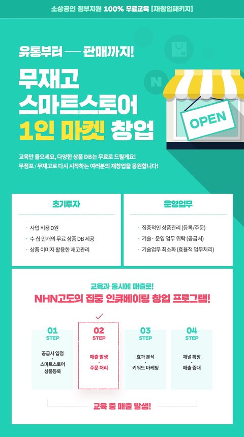 교육대상: 업종전환을 희망하는 소상공인 및 폐업자교육진행일자: 2019.06.10(월) ~ 2019.06.21(금) 교육시간: 13:00 ~ 18:00 (60시간) 교육장소: 서울특별시 구로구 디지털로 32길 29, 9층 (구로동, 키콕스 벤처센터)인원: 25명 수강료: 무료[교육프로세스]1.판매상품 공급처 세팅-확보된 5개 제휴 공급처로부터 확보된 상품을 세팅합니다.2.스마트스토어 상품 등록-1인 마켓에 최적화된 스마트스토어 상품을 등록합니다.3.매출발생-운영하는 업체 대표(멘토)를 통해 실전판매 노하우를 익힙니다.4.판매처확장-다양한 마켓 플랫폼을 활용하여 판매처를 확장합니다.[참여방법]1.소상공인 지식배움터 접속 (https://edu.sbiz.or.kr)2.현장교육>[재창업패키지] 클릭!3.[검색]창 교육명에 “1인 마켓 창업”입력 후 검색.4.교육과정명 클릭 후 하단 신청 버튼 누르면 완료.