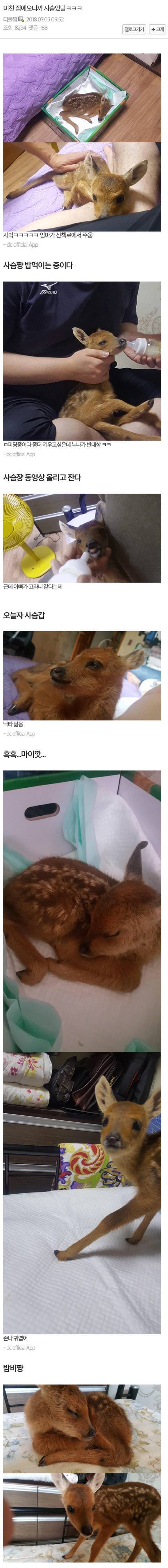 모든 동물이 아기땐 이쁘지.. 크면 사이즈 감당 안되고 냄새나고...그 때되면 야생성은 다 잃는데 집에서 키우는 건 말도 안됨.. 천천히 자연이랑 익숙해지게 하면서 보내주는게 맞지ㅜㅜ근데 아기사슴 이쁘다